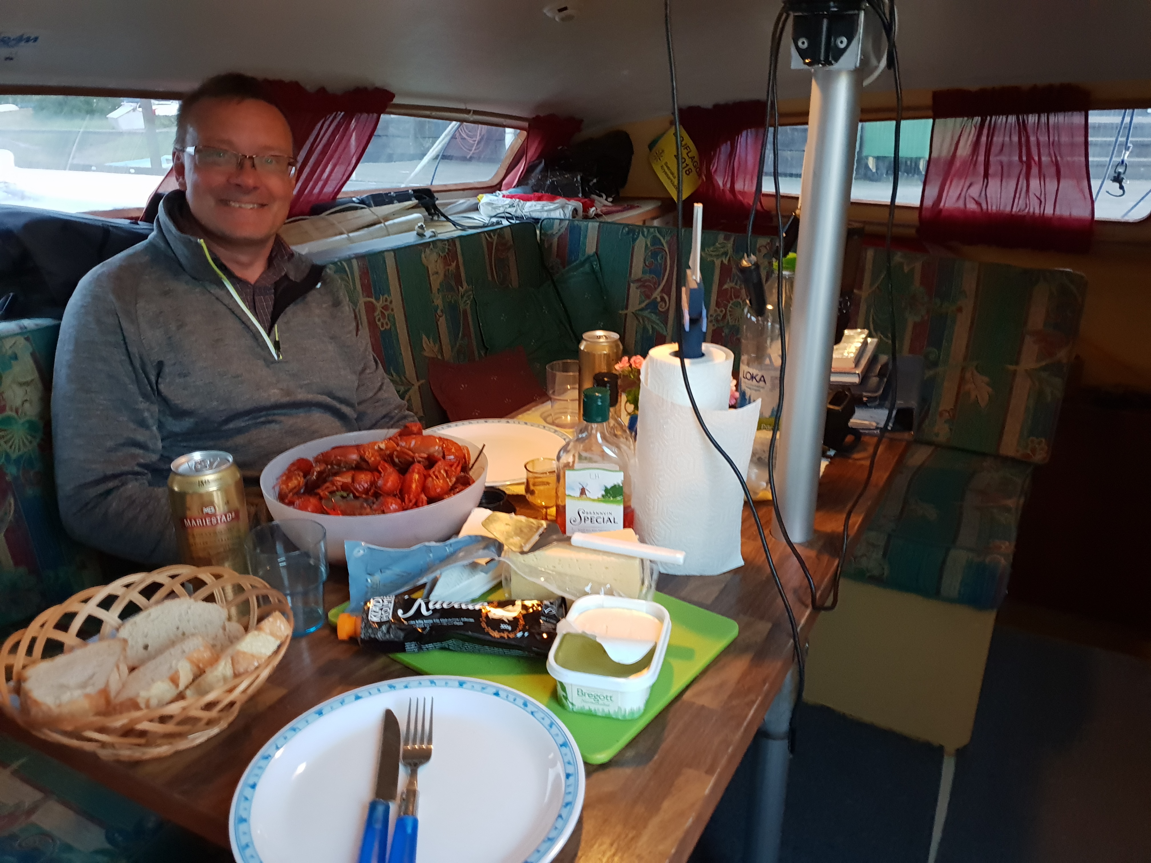 6 Published February 3, 2019 at 4032 × 3024 in 6 ← Previous / Next → Zweedse vriend Magnus in de kajuit, met het door hem meegebrachte maal van rivierkreeftjes (uit z’n ‘achtertuin’) en andere heerlijke dingen.